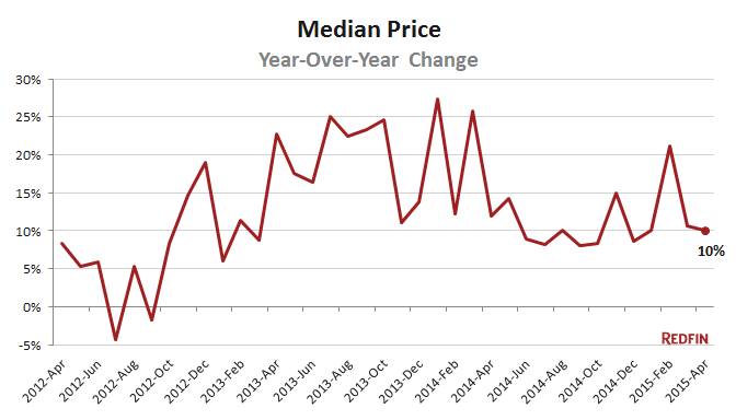 Chicago home prices notched their fourth-straight month of double-digit growth in April, with the median sale price rising 10 percent from a year ago. The number of properties sold fell 4.8 percent.