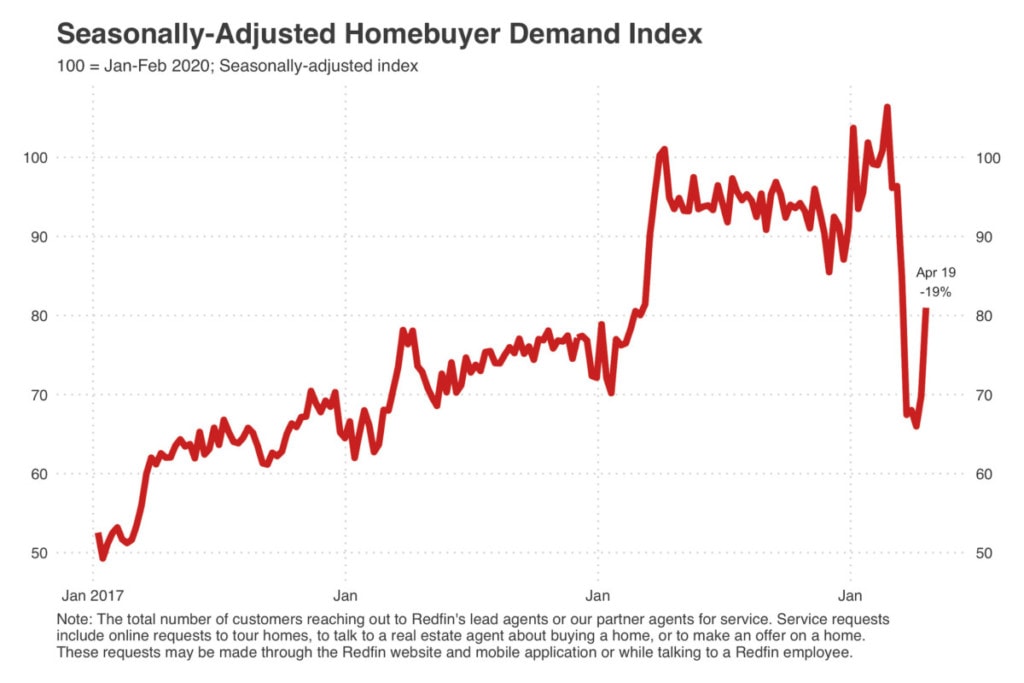 - Home-buying demand is down 19% from pre-coronavirus levels, but has increased every week since the start of April