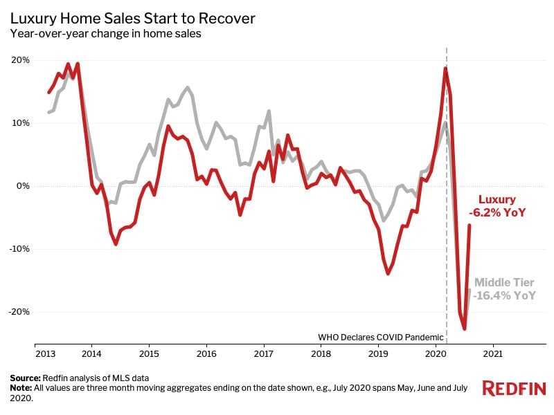 This is according to an analysis that divided all U.S. residential properties into tiers based on Redfin Estimates of the homes’ market values as of Aug. 10, 2020. This report defines “luxury” homes as those estimated to be in the top 5% based on market value. To represent non-luxury homes, we use the “middle” price tier, i.e. homes estimated to be in the 35th to 65th percentile for value.