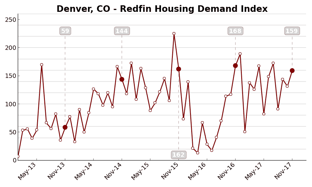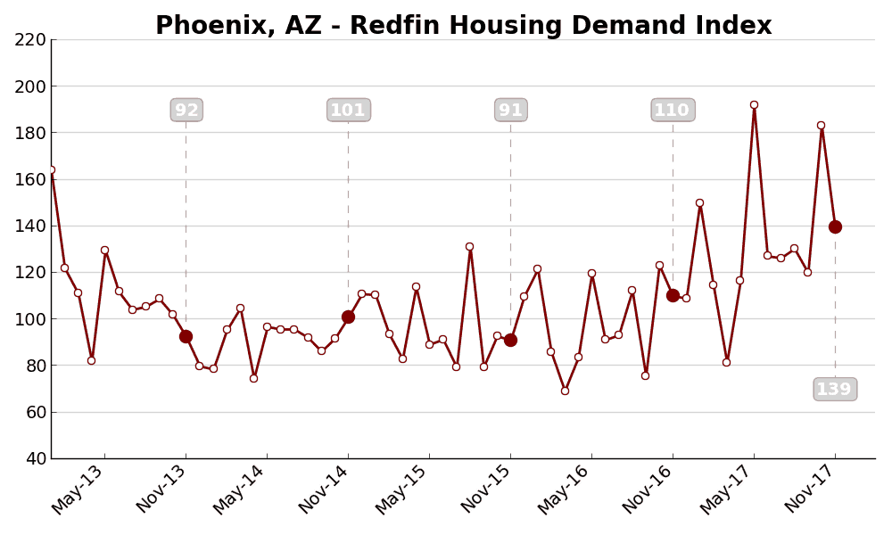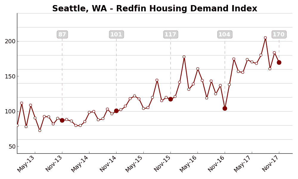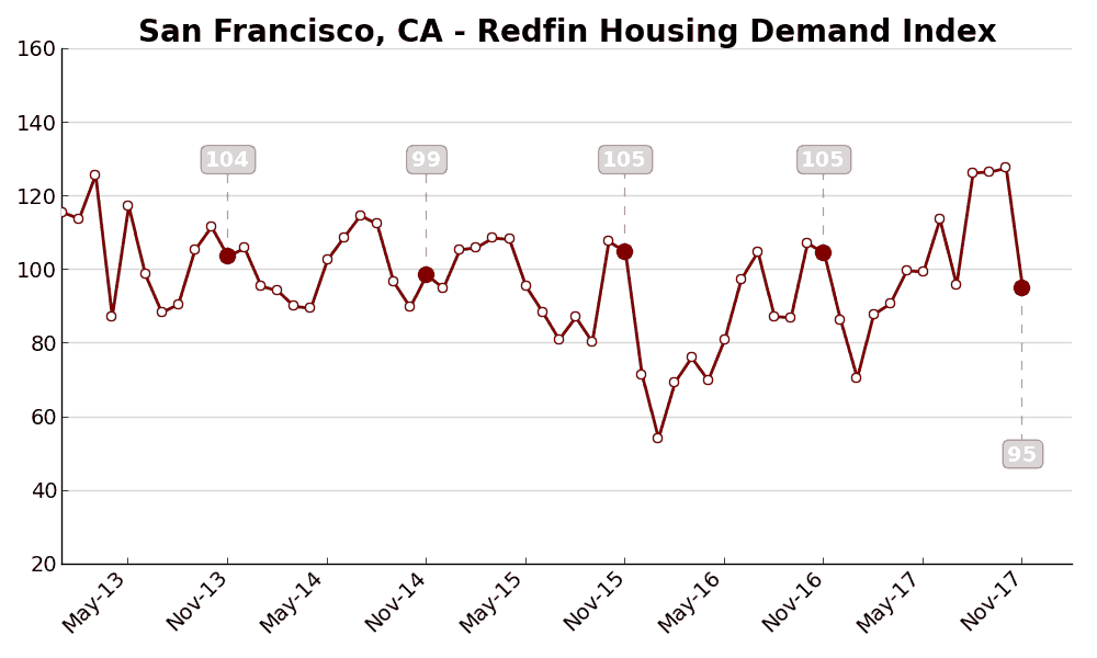 The Redfin Housing Demand Index fell 6.2 percent from 136 in October to 127 in November. The Demand Index is based on thousands of Redfin customers requesting home tours and writing offers. The seasonally adjusted number of buyers requesting home tours fell slightly by 1.9 percent, while the number making offers fell 14.7 percent.