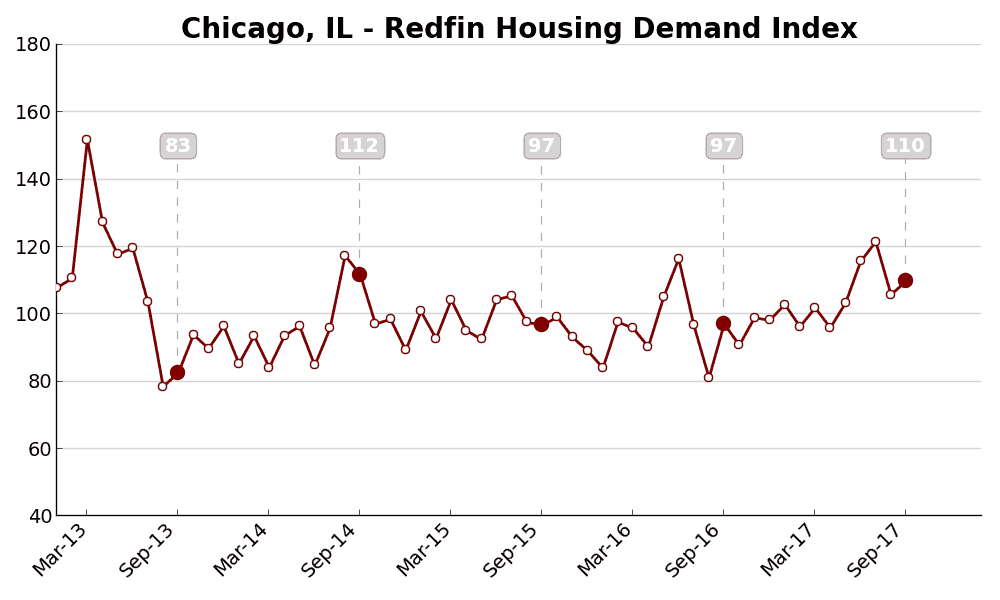 The Demand Index is based on thousands of Redfin customers requesting home tours and writing offers. A level of 100 represents the historical average for the three-year period from January 2013 to December 2015.