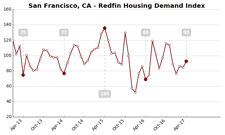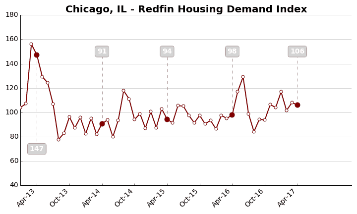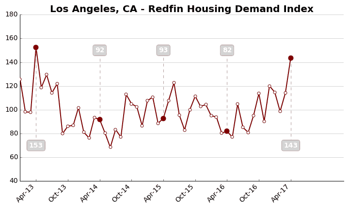 The Demand Index is based on thousands of Redfin customers requesting home tours and writing offers. A level of 100 represents the historical average for the three-year period from January 2013 to December 2015.