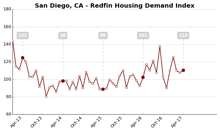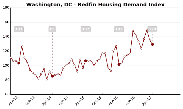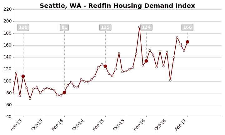 The Redfin Housing Demand Index increased 9.2 percent from March to a seasonally adjusted level of 121 in April.