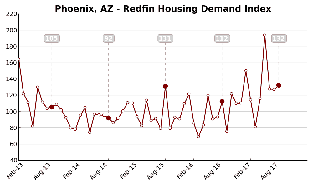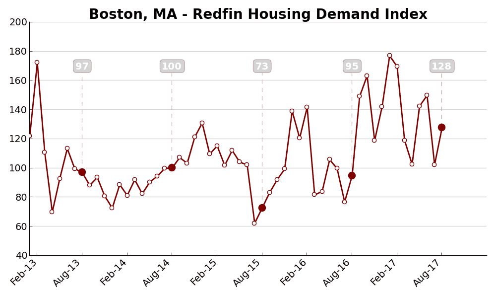 The Demand Index is based on thousands of Redfin customers requesting home tours and writing offers. A level of 100 represents the historical average for the three-year period from January 2013 to December 2015.
