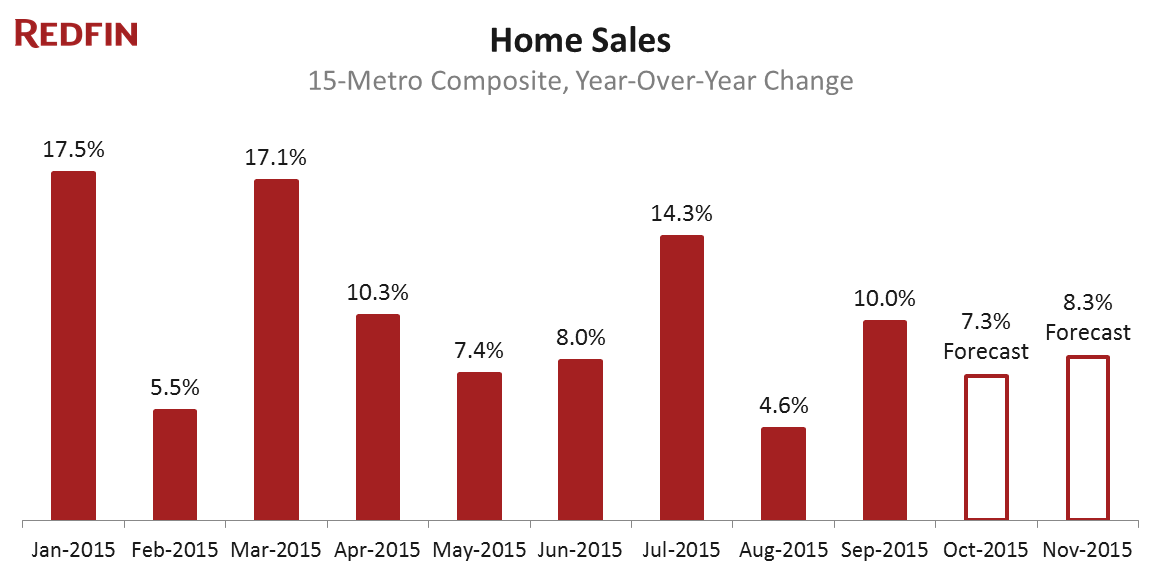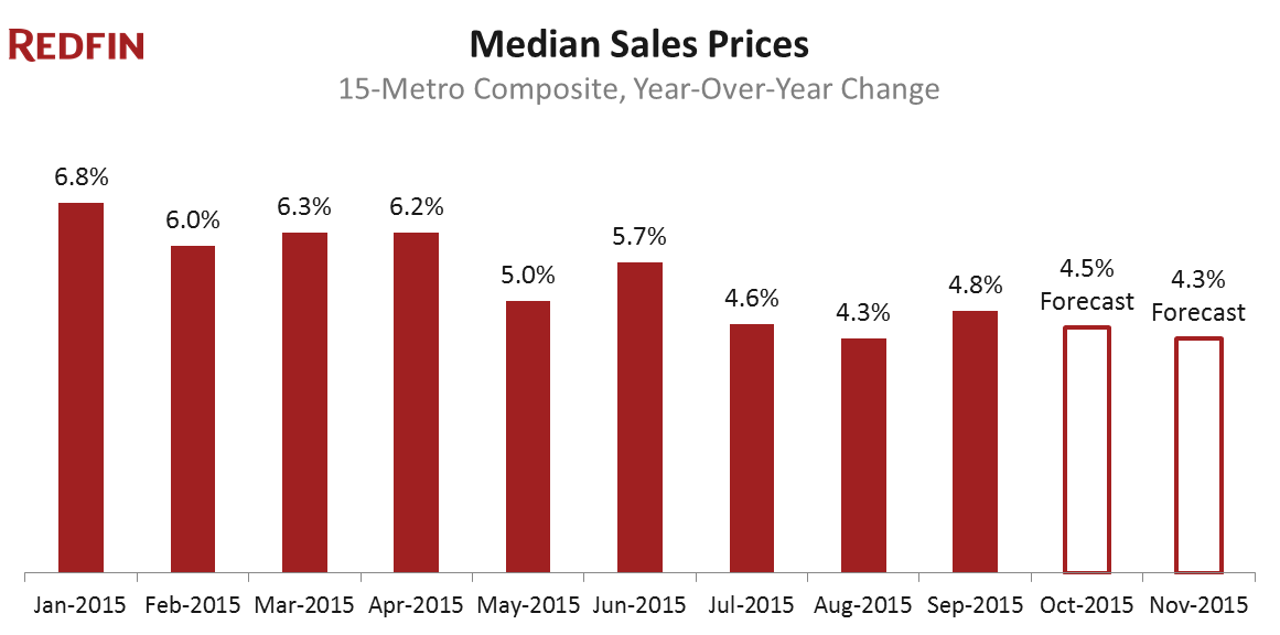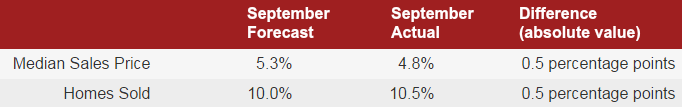 In September, the median sale price in the 15 metros that compose the Demand Index increased 4.8 percent from a year earlier. Our forecast was for 5.3 percent growth. September sales were up 10.5 percent year over year against our forecast of 10 percent.