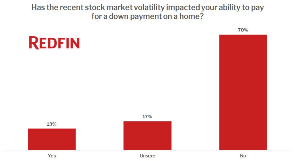 Redfin conducted a survey in March 2020 of more than 1,000 customers who plan to buy and/or sell a home in the next 12 months. Respondents were asked about how the novel coronavirus, or COVID-19, is impacting their perspective on the housing market as well as their home buying and selling plans. Of all respondents, the 761 who said they were planning to buy or buy and sell a home in the next 12 months were asked whether “the recent stock market volatility impacted your ability to pay for a down payment on a home?”