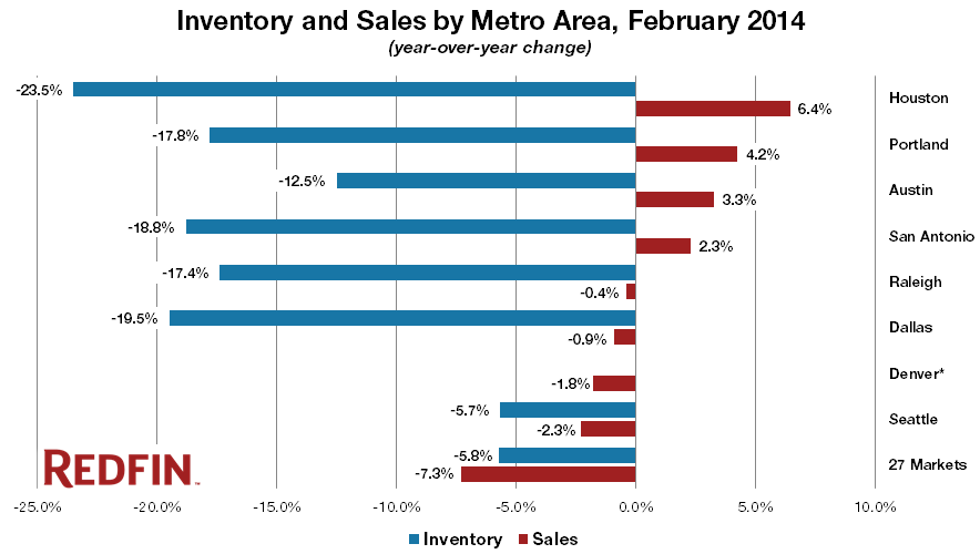 As we said last week, Austin, Dallas, Denver, Houston, Portland, Raleigh, San Antonio and Seattle are among Redfin’s fastest markets. In February, a total of 37.9 percent of homes went off the market in less than two weeks in these eight markets, compared with 30.7 percent last year, and 22.5 percent across 27 markets.