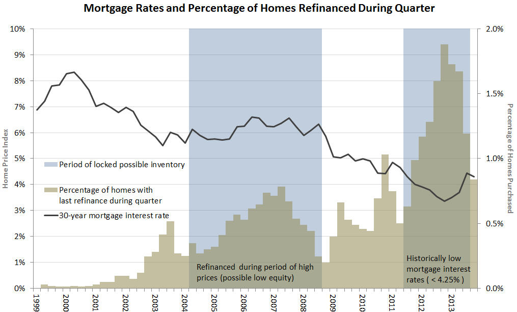 - Low mortgage rate (16%) — Homes purchased or refinanced when national mortgage interest rates were lower than 4.25 percent are considered to have low mortgage interest rates. These purchases and refinances occurred between 2011 and 2013.