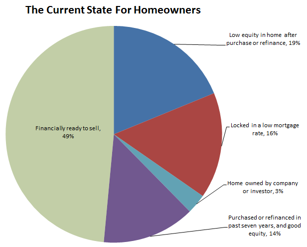 Fourteen percent of homeowners bought in the past seven years and have at least 20 percent equity in their home. The rule of thumb is that homes sell roughly seven years after their purchase. While they are financially ready to sell, their relatively recent home purchase means these owners are likely to stay put.